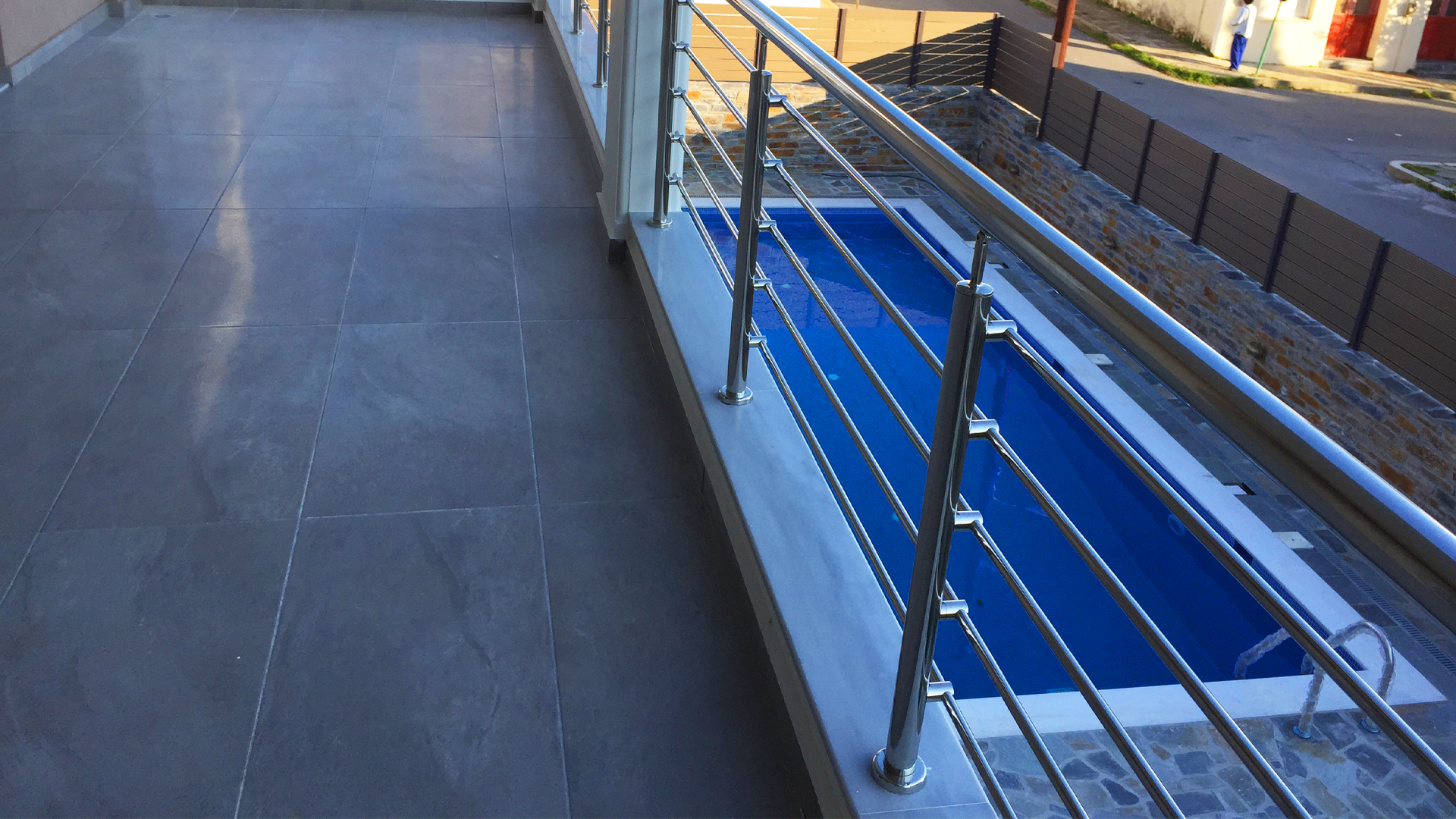 Στο περιβάλλοντα χώρο της κατοικίας βρίσκεται η πισίνα και περιμετρικά του κτιρίου υπάρχουν παρτέρια και αυλές με πέργκολες για τη σκίαση τους καλοκαιρινούς μήνες.
